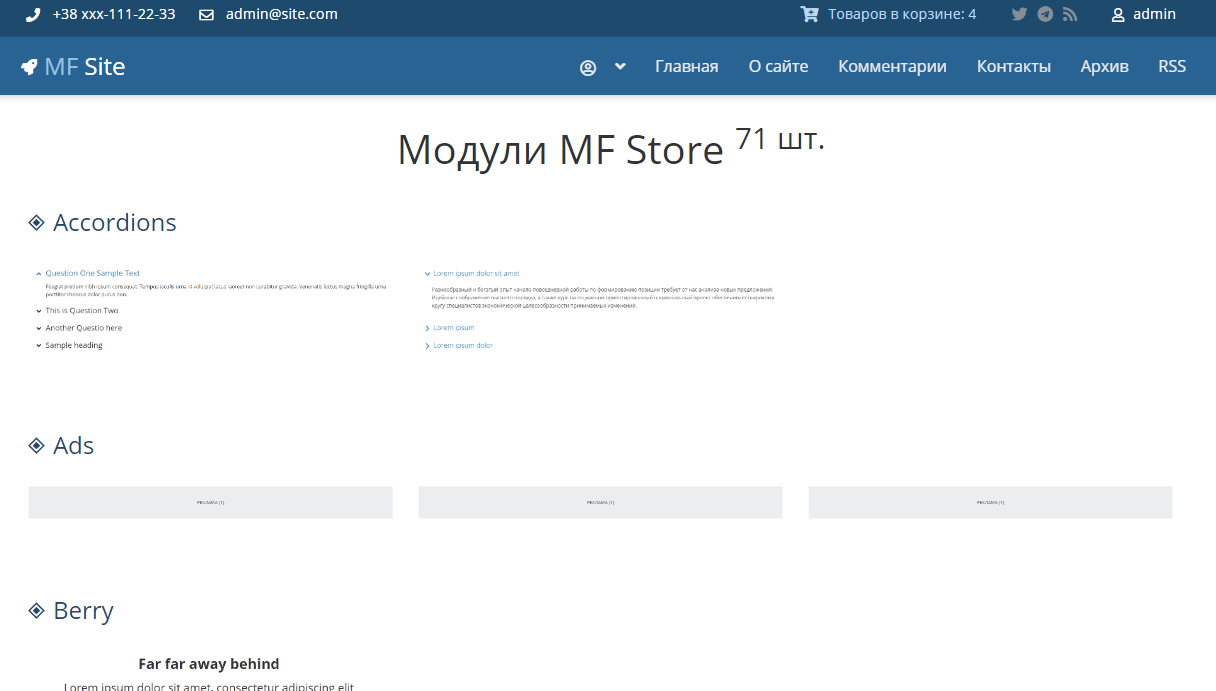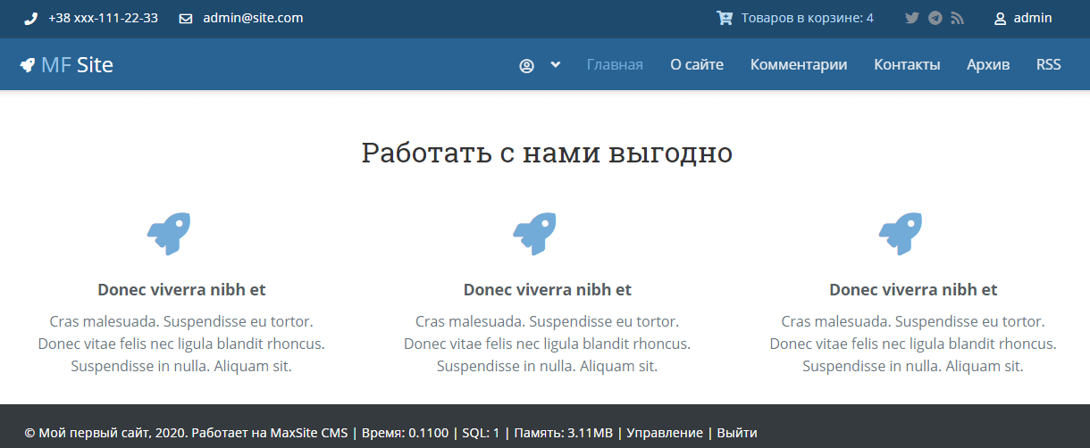 Со временем в MaxSite CMS родилась идея юнитов (units), когда программная часть была вынесена в отдельные файлы, а управлять и формировать вывод главной можно прямо из админ-панели.