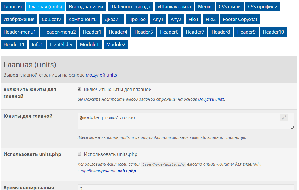 Некоторые модули изначально предназначены для такого использования в шапке сайта, однако намного чаще модули используются только для контента главной. Для этого перейдём на вкладку Главная (units), где снимем опцию Использовать units.php, чтобы вместо неё использовать опцию Юниты для главной. Укажем наш юнит: