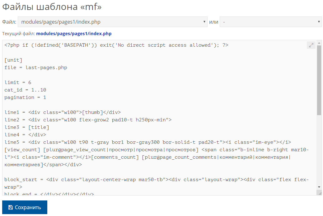 - Динамические модули более сложные, поскольку формируются на основе полученных данных. Например модуль pages/pages1 предназначен для получения и вывода записей сайта. Давайте рассмотрим как с ним работать.