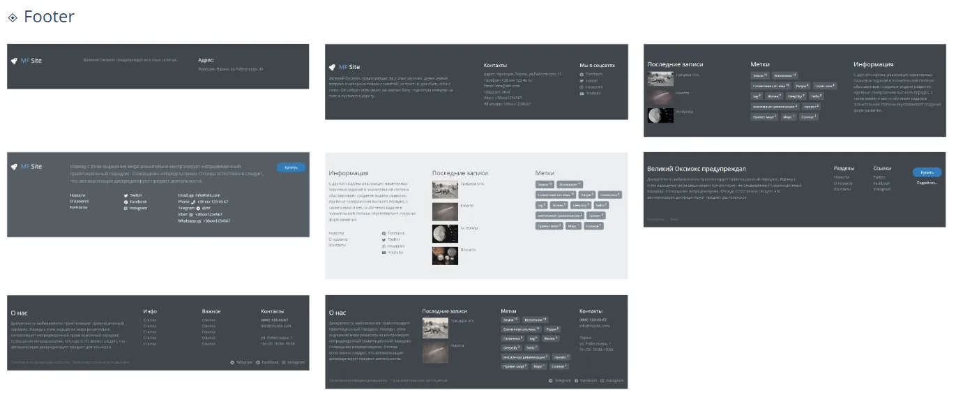 Обратите внимание, что часть модулей подвала содержит динамический контент. Это вывод последних записей, меток или рубрик. В таких модулях используется php-код соответствующих плагинов. Другие модули — статичные — в них используется обычный HTML. C ними работать немного проще.