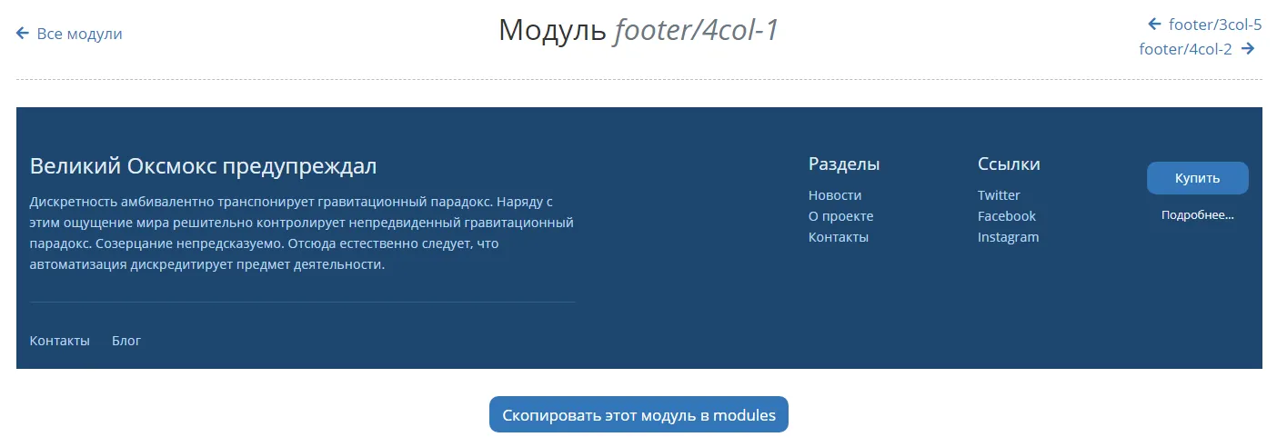 Раньше в шаблоне были и другие компоненты подвала, но теперь они перекочевали в обычные модули. Таким образом, чтобы подключить модуль подвала, нужно использовать тот же подход, как мы делали с шапкой и компонентом module1/2.