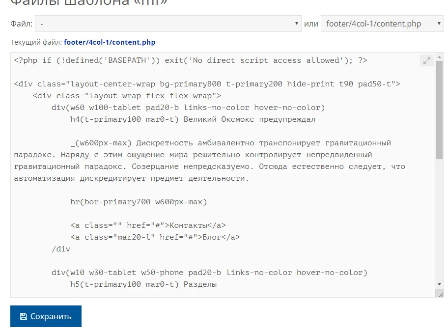 Редактирование модуля подвала точно такое же, как и любого другого модуля — через страницу «Файлы».