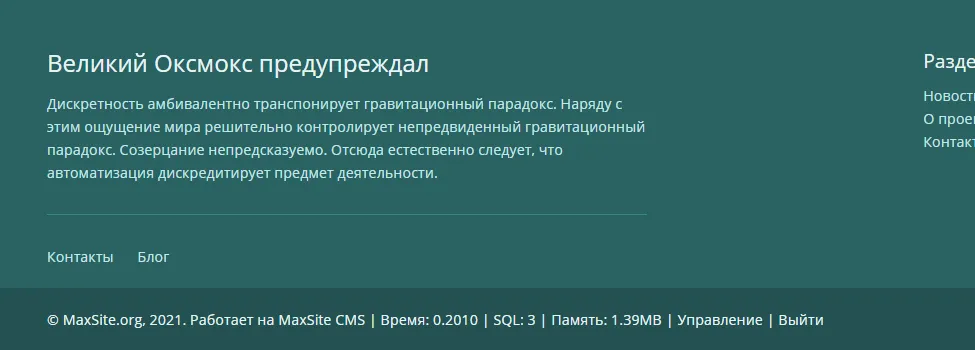 В MF для подвала есть один компонент — FooterCopyStat, который предназначен для вывода «технической» информации. Он имеет несколько опций. «Текст для вывода» используется для размещения html-кода, включая замены на текущий год, название сайта и ссылки на вход/логин. Другая опция «Контейнер (css-классы)» нужна для того, чтобы поменять оформление этого блока. По умолчанию это темный фон и светлые тексты. То есть компонент FooterCopyStat позволяет настраивать свой вывод в больших пределах.