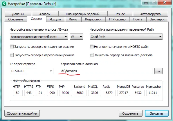 11. Открываем настройки OSP и на вкладке «Сервер» находим поле «Корневая папка доменов» указываем свой каталог, например «d:\domains». Сохраняем изменения, сервер будет автоматически перезапущен.