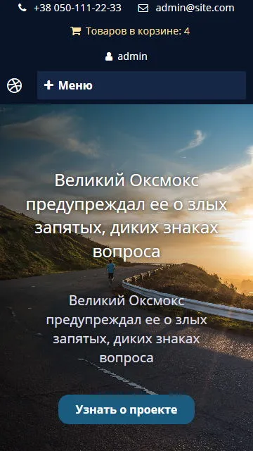 Компонент header-menu содержит несколько блоков: адрес/телефон, Корзину, иконку и название сайта, а также стандартное главное меню. Всё это настраивается через админ-панель. При скроллинге страницы, меню (с анимацией) фиксируется вверху и принимает вид с полупрозрачной плашкой:
