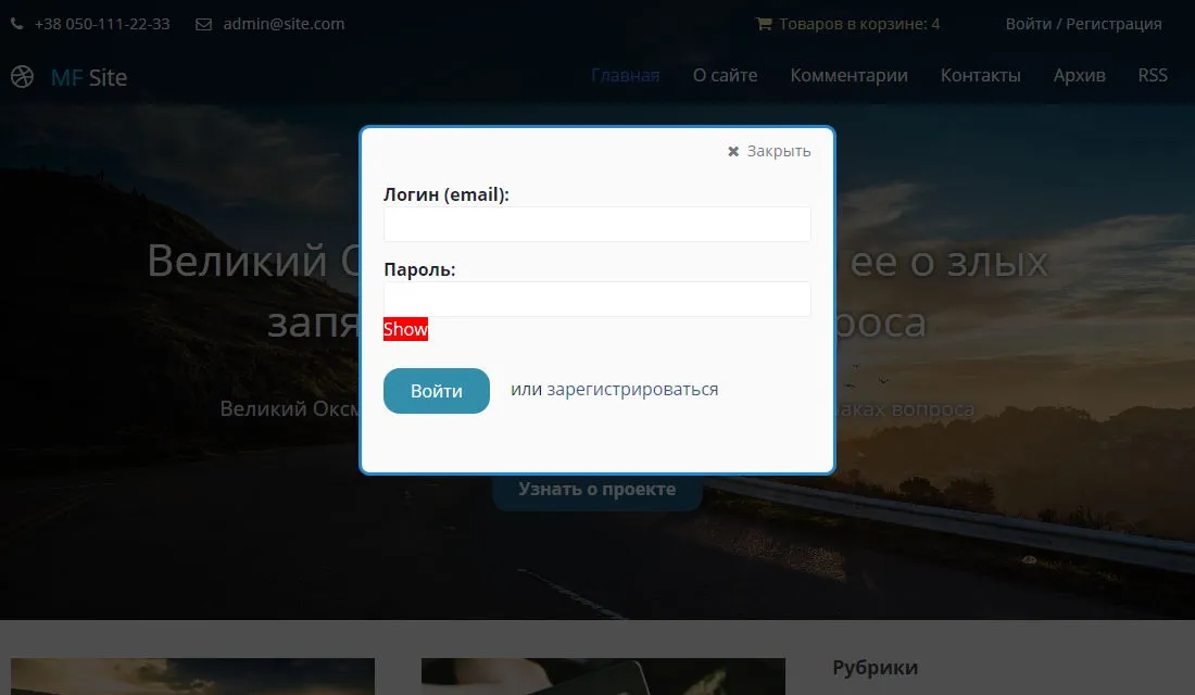 Если нажать ссылку «Войти», то откроется popup-окно с формой авторизации. Ссылка «Регистрация» ведёт на стандартную страницу регистрации MaxSite CMS.