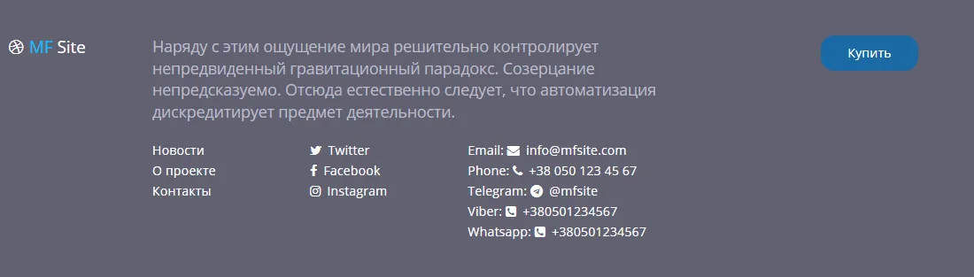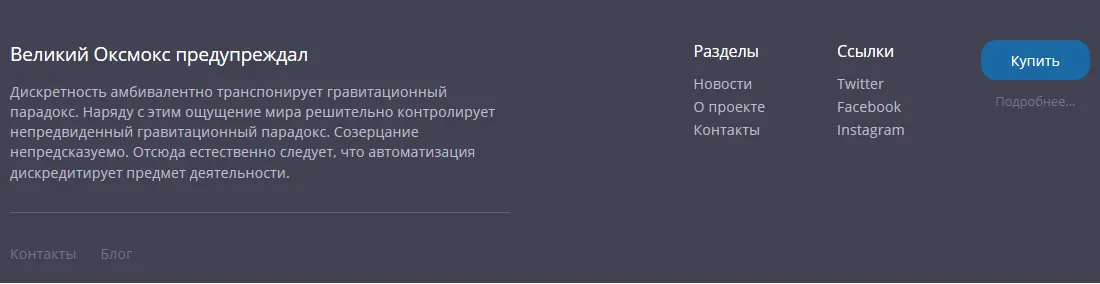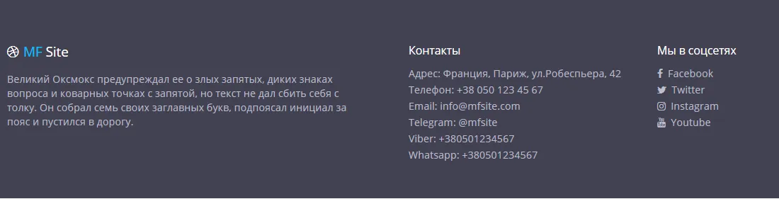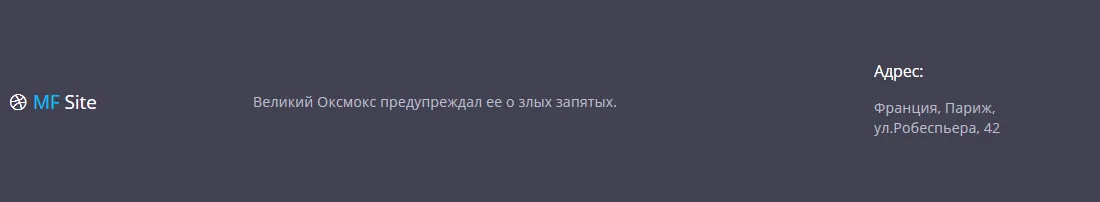 [options] rules = autotag_simple = 1 tmpl = 0 container_css = layout-center-wrap bg-gray800 t-gray400 pad50-tb t90 links-no-color hide-print wrap_css = layout-wrap flex flex-wrap flex-vcenter [/options] [col w20 w40-tablet] h4(i-dribbble t-white) <span style="color: #00bfff;">MF</span> Site [/col] [col w55 w100-tablet flex-order2-tablet] Великий Оксмокс предупреждал ее о злых запятых. [/col] [col w20 w40-tablet] h5(t-white) Адрес: _ Франция, Париж, ул.Робеспьера, 42 [/col]