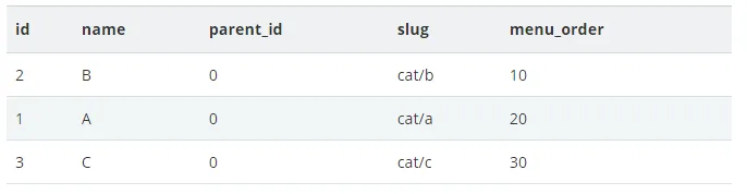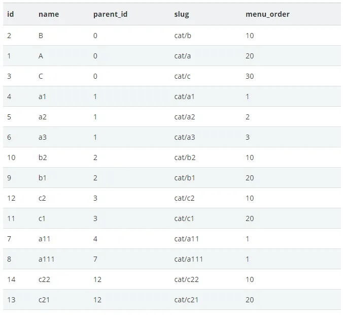 $rows = Pdo\PdoQuery::fetchAll($db, 'SELECT * FROM cat ORDER BY parent_id, menu_order;'); echo Pdo\PdoQuery::outTableRows($rows);