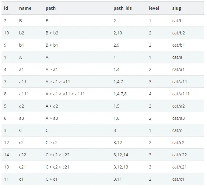 Поле path в общем-то не особо востребовано, но я его сделал для визуальных целей — так проще воспринимать таблицу. А вот поле path_id может использоваться если нужно получить данные текущей ветки — фактически это готовое условие IN.