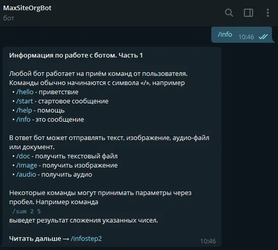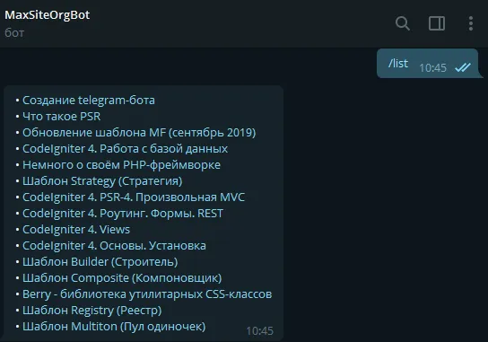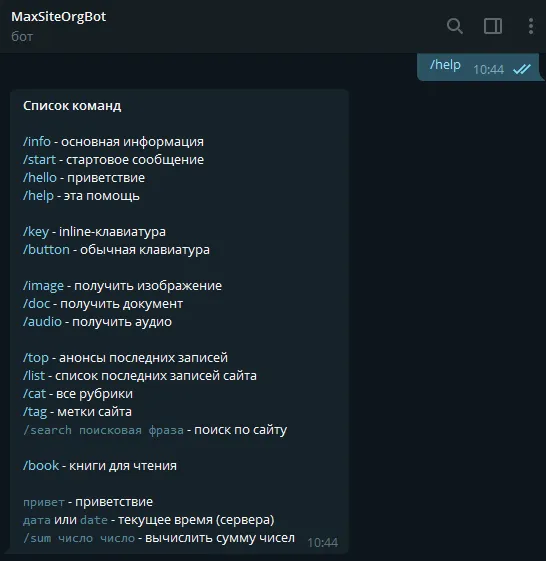 Запустил telegram-бот MaxSiteOrg_bot для своего (этого) сайта. Бот в общем-то больше призван показать возможности ботов как таковых, а также возможную интеграцию с сайтом. Например доступен вывод последних записей, рубрик и меток.